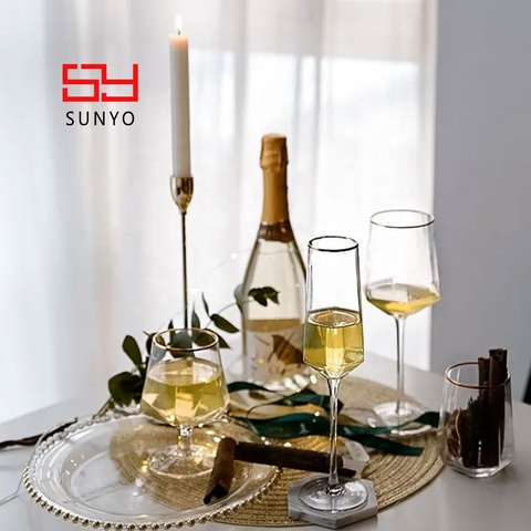 مشغولات يدوية مخصصة مضلعة حافة ذهبية عتيقة شفافة ذات جودة طويلة كوبيه شمبانيا كوكوخ زجاجي لحفلات الزفاف